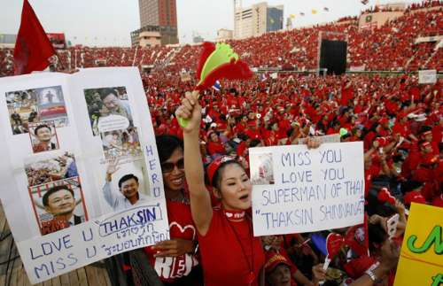 周六晚,多達五萬名他信支持者齊集在曼谷一個球場內,參加集會。身在海外的他信發表預先錄制的錄像講話,向支持者說,如果軍方領袖繼續干涉政事,泰國的混亂局面將會永無止境,延續下去。臺下的群眾大多穿上紅衣,以示團結,他們聽到他信的講話都歡呼喝采。