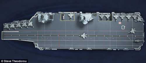比例1:200的“伊麗莎白皇后號”和“韋爾斯親王號”模型,目前擺放在航母設計總部的大堂。每艘母艦有6層甲板,最頂是巨型起飛甲板,可運載36架最先進的聯合攻擊戰斗機和4架直升機,每艘航母能在15分鐘內讓24架飛機升空。