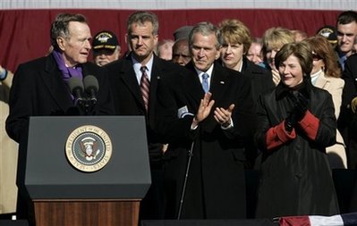 據“中央社”報道,布什與親近家人及高層官員,參加核子動力航空母艦“布什號”(USS George H.W. Bush)下水服役儀式。總統當選人奧巴馬1月20日進入白宮時,布什將卸下總統職務。