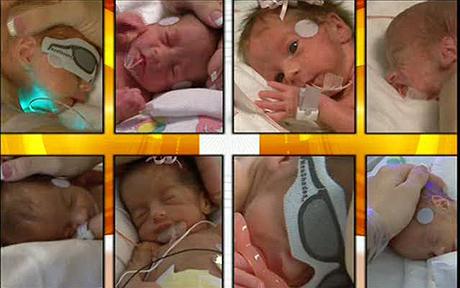 據東森新聞報道,出生至今兩個星期,八胞胎的母親娜達雅蘇利曼(Nadya Suleman)通過美國國家廣播公司的鏡頭,把孩子們一一介紹給大眾認識。擔心自己的手太冰冷嚇到孩子,娜達雅蘇利曼還刻意把雙手搓了搓,才小心翼翼地輕輕撫摸孩子。這八胞胎都非常瘦小,身高可能都只到他們母親雙手手掌相連的長度而已。