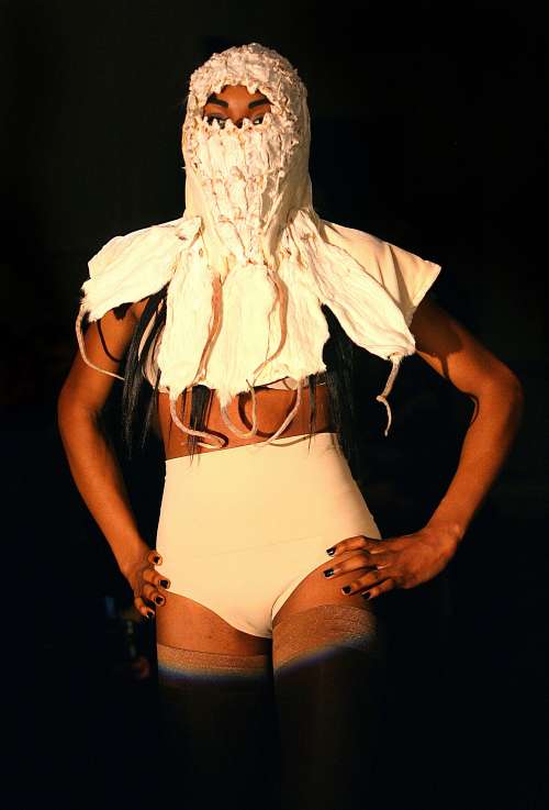 模特兒佩戴著這款遮蓋了整張臉,只露出眼睛的頭飾,在天橋上婀娜多姿地走過,老鼠尾巴在額前晃來晃去,鼠須輕輕碰觸她的皮膚。這款頭飾是法國出生的高級理發師查利-勒門杜的作品。