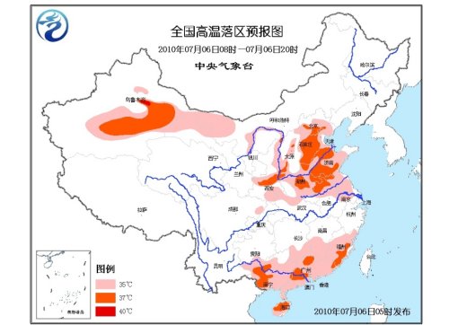 中新網7月6日電 中央氣象臺6日清晨6時繼續發布高溫黃色預警:預計,今天白天,甘肅西北部、內蒙古中西部的部分地區、陜西東部和南部、華北大部、黃淮大部、湖北西北部、江淮東部、湖南南部、江西南部、華南大部等地有35~37℃,北京、河北中南部、山東西北部、陜西關中等地的部分地區有38~40℃的高溫天氣。