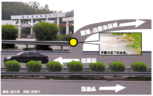 昨日記者來到事發現場,幾位揭陽市公安局交警支隊惠來高速公路大隊的民警正在現場做警戒。警戒線圍起的事發地點,就位于深汕高速進入服務區路口不遠處。這個路口可以通往惠來縣城,也可通往惠來高速公路大隊。