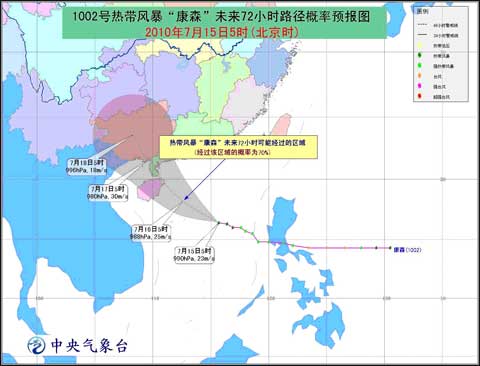 預(yù)計(jì),“康森”將以每小時(shí)20公里左右的速度繼續(xù)向西偏北方向移動(dòng),強(qiáng)度將有所加強(qiáng),并逐漸向海南陵水到廣東陽(yáng)江一帶沿海靠近,將于16日下午到17日凌晨在這一帶沿海登陸。