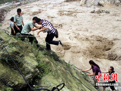 由于連續的降雨讓綿茂公路漢旺至清平段多處出現的不同程度的塌方,道路中斷。當消防官兵行至距離天池高橋段6公里處,山體滑坡留下的滾石和湍急的山洪將去路切斷,消防車和救援船艇無法前行,情況緊急,中隊長田海南迅速命令全體人員攜帶救援裝備涉水前進。消防官兵立即將救援橡皮艇放入水中,哪知兇猛的洪流將橡皮艇沖得無法穩槳,被水中的亂石劃破,無法使用救援工具,行進又萬分艱難,消防官兵只得摸著山體,踏著過膝的洪水摸索前進。1個多小時后,終于到達了時發地點。此時,河床寬度達20余米,洪流湍急。