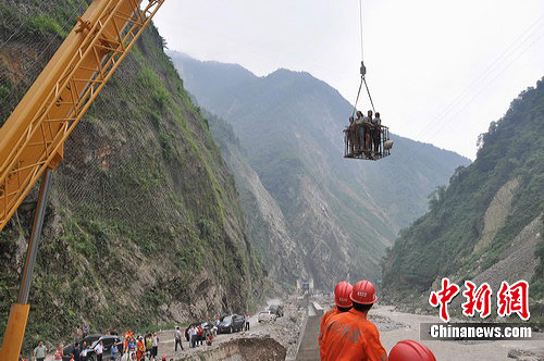 事發后,綿竹市政府立即調派大型機械疏導交通。10時許,隨著水位下降,綿竹市防洪辦率礦山救援隊和大型吊車、裝載機進入天池鄉。德陽市消防支隊副支隊長李先平也率增援力量到達現場。現場成立救援指揮部,并根據現場情況部署改進救援方案。由于水位下降后,河床寬度明顯減小,指揮部決定利用吊車長臂懸掛鋼筋鐵框伸過河床救人,一次可以裝上6、7個人,大大減少了救援時間。15時許,經過全體救援人員的不懈努力,50余名被困人員被成功解救,無一人受傷。