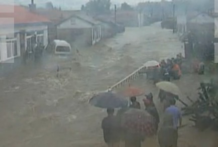 這里就是延邊州敦化市的大蒲柴河鎮的小蒲柴河村,27日到28號這場特大降雨讓這個村莊的受災十分的嚴重,您可以看到我身后的這些很多瓦房都已經被這個洪水給沖垮了,而我右手邊這個小商店是村民韓秉芬家新修的房子,所以它相對的結實和堅固。洪水來臨以后很多村民就開始淌著水趕到這里一起聚在這里壯膽,但是洪水越來越大,門口這個低洼地帶已經形成了洶涌的急流,水是深不可測,隨著洪水越來越大也通過這個窗戶開始漫入這個屋內,此時這個商店其實已經是一個名副其實的‘孤島’,16位村民被困其中。