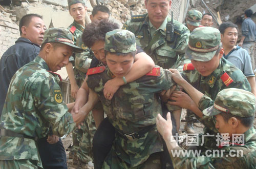 黑夜中,不少戰(zhàn)士的手和腳被埋在泥石中的鋼筋、瓦礫刺破,鮮血直流,官兵心中只有一個(gè)念頭:對(duì)廢墟下每個(gè)可能幸存的生命,不拋棄,不放棄!一名婦女被救出了,頭上血流不止,戰(zhàn)士郭永寬撕開自己的背心替他包扎。戰(zhàn)士田維宇見到一個(gè)被救的老人凍得發(fā)抖,脫下自己身上僅有的一件衣服給她穿上。班長宋楠楠長時(shí)間用手挖掘尸體,手劃破了,鮮血直流,他顧不上包扎連續(xù)戰(zhàn)斗。十幾個(gè)小時(shí)沒進(jìn)一粒食,沒喝一口水,沒合一下眼,50名參戰(zhàn)官兵就是憑著100條手臂,在8日第一時(shí)間從廢墟中搶救出32條鮮活的生命。
