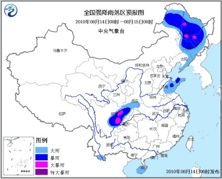 中新網8月14日電 中央氣象臺14日06時繼續發布暴雨黃色預警:8月14日08時到8月15日08時,四川盆地大部、陜西南部、山東中南部和東部、內蒙古東北部、黑龍江大部、吉林大部、遼寧東部以及海南大部、云南西南部等地的部分地區有大雨或暴雨.