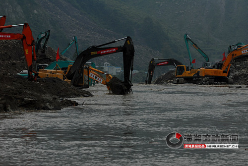 15日中午,映秀鎮(zhèn)紅椿溝段的泄洪渠已順利打通,有水流通過,岷江對映秀新鎮(zhèn)的沖擊減少,此后搶險隊伍連續(xù)施工,將岷江原河道(現(xiàn)在被泥石流截斷)的泄洪渠拓展到了寬35米、深10米、長550米。