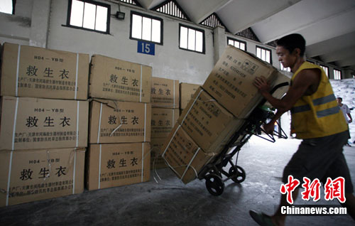中新網成都8月20日電 (記者劉忠俊)21日上午10時35分,國家防總緊急調撥80艘沖鋒舟,40支橡皮舟、120臺船外機、1萬件救生衣、4000片鉛絲籠網片、4000個鋼絲網兜、500盞查險燈等搶險救災物資的“搶17/18次”救災專列抵達四川成都火車東站。