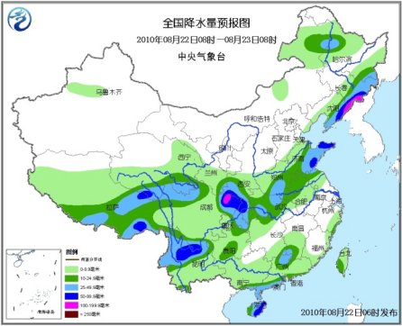 22日08時至23日08時,新疆天山地區西部、西藏大部、青海東部和南部、甘肅南部、陜西南部、內蒙古東部、東北大部、華北南部、黃淮、江淮大部、江漢大部、江南南部、華南大部、西南地區大部以及臺灣等地有小到中雨或陣雨,其中,四川盆地北部、重慶中東部、陜西南部、湖北西部和北部、河南南部、山東中東部、遼寧東部、吉林東部、黑龍江東南部以及西藏東部、青海東南部、川西高原北部和南部、云南北部、華南南部等地的部分地區有大雨或暴雨,四川盆地北部、遼寧東部、吉林東南部等地的局地有大暴雨;上述地區局部并伴有短時雷雨大風等強對流天氣。。
