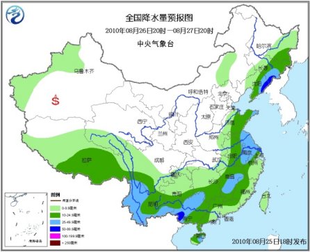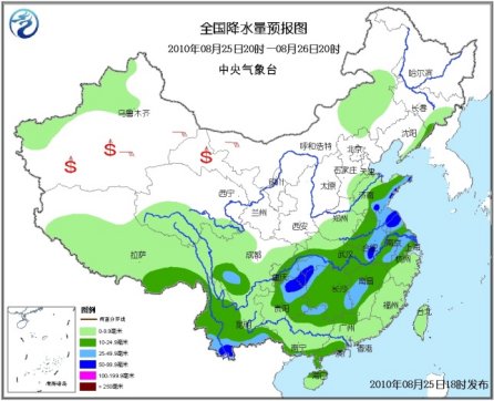 25日20時至26日20時,新疆西部、西藏中東部、青海南部、內蒙古東部、遼寧東部、吉林東南部、華北南部、黃淮、江淮、江漢、江南、華南、西南大部等地有小到中雨或陣雨,其中,四川南部、重慶東南部、湖北西南部、湖南西北部、江西西部、安徽南部和東部、山東東南部、江蘇大部、浙江西北部、廣西東南部、云南南部等地有大雨,部分地區有暴雨;上述部分地區并伴有短時雷雨大風等強對流天氣。新疆東部及南疆盆地、甘肅西北部、內蒙古西部等地有5~7級風;南疆盆地和甘肅西部的部分地區有揚沙或浮塵天氣。渤海有5~6級東北風;黃海北部海域有6~7級、陣風8級的東北風;黃海中部海域有6~7級、陣風8級的旋轉風;黃海南部海域、南海中部海域、北部灣有5~6級西南風。