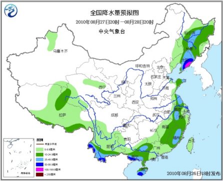 26日20時至27日20時,新疆天山局部地區和南疆西部、青海南部、西藏南部和中東部、內蒙古東南部、東北中南部、華北東部和南部、黃淮大部、江淮大部、江漢南部、江南、華南大部、西南大部等地有小到中雨或陣雨,其中,吉林南部、遼寧中東部、山東半島東部、江蘇東部和南部、安徽南部、浙江西部、江西東北部以及湖南南部、貴州東部廣西中東部、海南西部、云南中西部等地有大到暴雨,遼寧東部的局部地區有大暴雨;上述部分地區并伴有短時雷雨大風等強對流天氣。新疆北部、內蒙古東部、東北有4~6級風。南疆盆地的部分地區有揚沙或浮塵天氣。黃海北部和中部海域將有6~7級、陣風8級的旋轉風;南海中部海域將有5~6級、陣風7級的旋轉風。