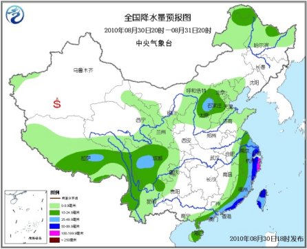 30日20時至31日20時,新疆南疆西部、西藏大部、青海東部和南部、西北地區中東部、內蒙古中西部和東北部、黑龍江大部、遼寧西部、華北大部、黃淮東部、江淮東部、江南東部、華南東部和南部、四川大部、重慶西部、貴州西北部、云南大部等地有小到中雨或陣雨,其中,川西高原中部、山西東北部、江蘇東南部、上海、浙江中東部、福建東部沿海、廣東東部沿海、臺灣等地有大雨或暴雨;浙江東部的局部地區有大暴雨;上述部分地區并伴有短時雷雨大風等強對流天氣。新疆南疆盆地南部的部分地區有揚沙或浮塵天氣,新疆南部、內蒙古東部、東北北部等地有4~5級風。受“獅子山”和第8號熱帶風暴的共同影響,東海南部海域、南海北部海域、臺灣海峽、臺灣以東洋面的風力將有6~8級,陣風可達9~10級,其中南海北部部分海域的風力將有9~11級,陣風可達11~12級。
