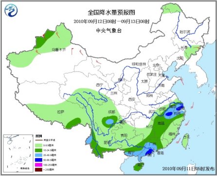 11日08時至12日08時,新疆西北部、青海南部、西藏中東部、吉林南部、遼寧中北部、江淮大部、江南中東部和南部、華南以及西南地區大部有小到中雨或陣雨,其中,江蘇東南部、上海、浙江大部、江西東北部和東南部、福建大部、廣東中南部和東部、廣西南部、云南南部等地有大雨或暴雨;上述地區局部并伴有短時雷雨大風或冰雹等強對流天氣。新疆北部、甘肅西部等地有4~6級風。黃海南部海域、東海西部和北部海域將有7~8級、陣風9~10級大風。