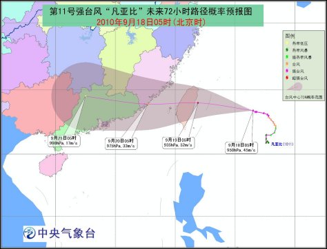 中新網(wǎng)9月18日電 中央氣象臺18日8時發(fā)布消息稱,今天,第11號強臺風“凡亞比”將以每小時15~20公里的速度向臺灣沿海進發(fā),強度繼續(xù)加強,可能發(fā)展為超強臺風。受其影響,臺灣和東南沿海將遭遇狂風暴雨。中央氣象臺6時已經(jīng)發(fā)布臺風紅色預(yù)警。