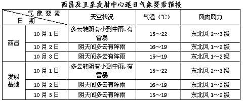 中國西昌衛(wèi)星發(fā)射中心的權(quán)威發(fā)布:“嫦娥二號”衛(wèi)星今天(10月1日)晚上即將迎來第一個發(fā)射窗口。預計今天空間天氣平靜,對嫦娥二號發(fā)射過程無不利影響;今天到4日,西昌市及衛(wèi)星發(fā)射基地以陰天或陰天間多云天氣為主,多陣性降水。