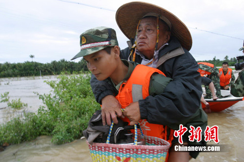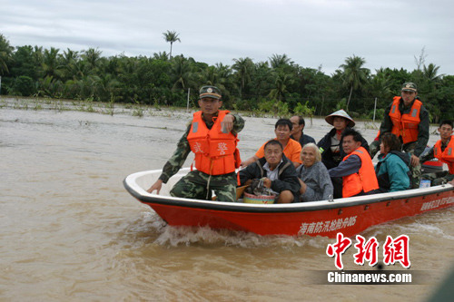 13時許,萬寧市萬城鎮紅關村暴雨持續不斷,1000余名村民需緊急轉移撤離。武警三亞市支隊奉命派出120名官兵,攜帶救生衣、雨衣等搶險物資驅車趕往紅關村疏散轉移被困村民。由于村民躲在家里不愿上救生艇,官兵們一邊耐心說服、勸導,一邊協同地方領導組織村民向安全地帶轉移。經過將近6個小時的緊急撤離,所有被困村民安全轉移到安全地帶。