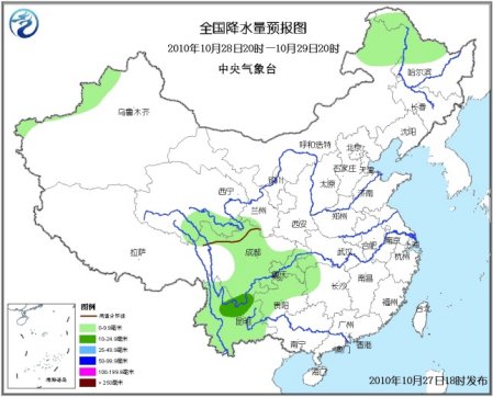 中新網(wǎng)10月27日電 據(jù)中央氣象臺(tái)預(yù)報(bào),未來(lái)三天,新疆西部山區(qū)和北部、西藏東部、青海南部、甘肅南部、川西高原北部、內(nèi)蒙古東北部、黑龍江北部等地有小雨(雪)或雨夾雪。陜西南部、西南地區(qū)大部、湖北西南部、湖南西北部等地有小到中雨。
