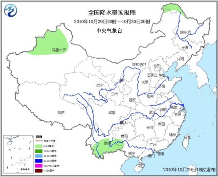 10月30日20時至31日20時,新疆沿天山地區、西藏東部、青海東南部、川西高原北部、內蒙古東北部、黑龍江中北部有小雨(雪)或雨夾雪;四川中西部、云南西北部、臺灣東部等地的部分地區有小雨或陣雨。內蒙古東部、東北中北部、華南沿海等地有4~6級風。臺灣海峽、臺灣以東洋面和以南海域、南海東北部海域、中部和西南部海域將有7~8級、陣風9級的東北風。另外,黃海南部海域、東海北部海域將有5~6級的偏北風;東海南部海域將有6~7級、陣風8級的東北風;南海西北部海域、北部灣將有5~7級的東北風。