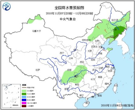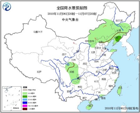 6日20時至7日20時,甘肅南部、川西高原東北部、內蒙古中部和東部偏南地區、東北地區中南部、華北北部等地有小到中雨(雪)或雨夾雪;四川盆地大部、重慶西南部、貴州西北部、福建東北部、廣東珠江三角洲地區、海南、臺灣等地有小到中雨或陣雨。內蒙古中東部、東北地區、華北等地有4~6級風。渤海、黃海北部將有4~6級西南風轉7~8級、陣風9~10級的西北風。東海南部、南海西北部和南部、北部灣將有4~6級東北風;臺灣海峽、臺灣以東洋面和以南海域、南海東北部和中部海域將有6~7級、陣風8級的東北風。
