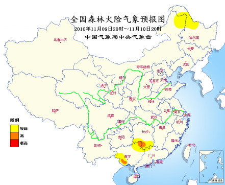 此外,干燥少雨的天氣同樣也使得森林火險氣象等級升高。中央氣象臺預計,11月9日20時至11月10日20時,黑龍江西北部、內蒙古東北部、湖南南部、廣東北部、廣西東北部和西南部的部分地區森林火險氣象等級較高,其中,湖南西南部、廣西東北部和西南部的局部地區森林火險氣象等級高,請當地有關部門注意防火。