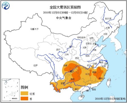 今天早晨到上午,西南地區東部和南部、江南大部、華南西部和北部等地有輕霧,其中,湖南西部、江西中北部、安徽南部、浙江西部、福建中西部、四川東部、重慶大部、貴州東部和南部、云南南部等地的部分地區有能見度不足1000米的霧,局部地區能見度不足200米。