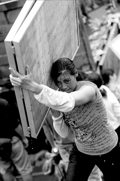 羅炳輝將軍廣場是彝良最大的災民安置點之一,2000名受災群眾集中安置在百余個帳篷內。50多歲的毛振強和老伴帶著兩個孫子一起住在帳篷里。前天夜間,他和安置點的其他人一樣,被大風和暴雨擾得睡不著覺。昨天凌晨1點左右,廣場上開始積水,很快水就漫過薄薄的紙板,被褥衣物都洇濕了。“我們趕緊把東西收拾起來,就這么站了一夜沒能睡覺。”由于帳篷內物品進水,昨天白天,安置點內的很多災民連坐的地方都沒有,蹲在地上吃飯,也沒法睡覺。