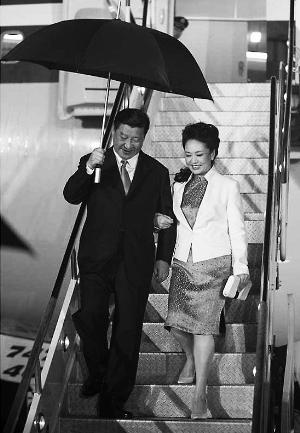 當地時間晚7時10分許,習近平乘坐的專機抵達西班牙港皮亞科國際機場。這是中國最高領導人首次對特立尼達和多巴哥以及英語加勒比國家進行國事訪問。特立尼達和多巴哥總統卡莫納夫婦、總理比塞薩爾冒雨親自到機場迎接習近平和夫人彭麗媛的到來。