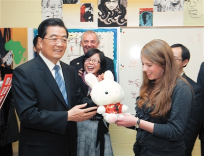 胡錦濤也選擇了一所中學(xué)參觀——芝加哥佩頓中學(xué),并向中文班學(xué)生贈送新春禮物,一個(gè)白兔玩偶。在中美發(fā)表的聯(lián)合聲明中,雙方重申致力于建設(shè)二十一世紀(jì)積極合作全面的中美關(guān)系。