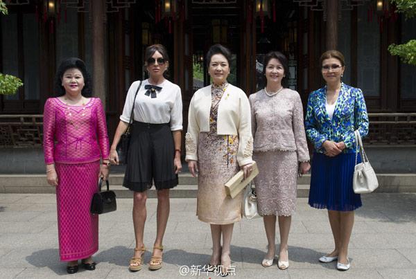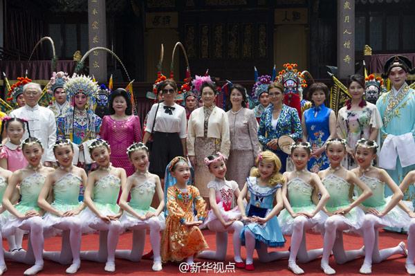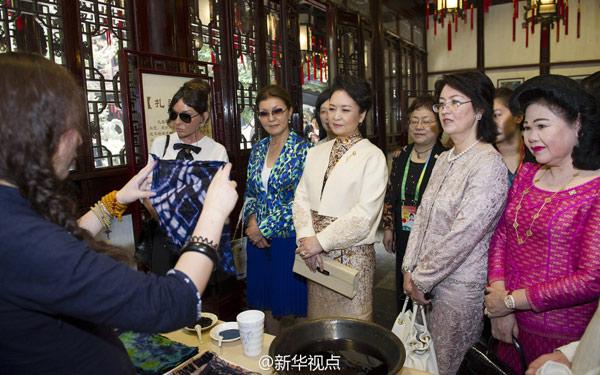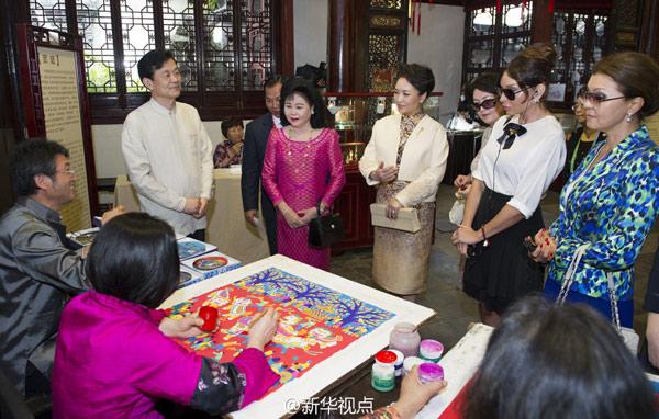 彭麗媛和貴賓們到上海豫園,參觀金山農民畫、面塑、顧繡、木版水印、扎染等展示,欣賞少兒歌舞《茉莉花》、昆曲《牡丹亭》選段、滬劇與二胡《燕燕做媒》、太極·古琴《高山流水》、京劇選段《梨花頌》等演出。