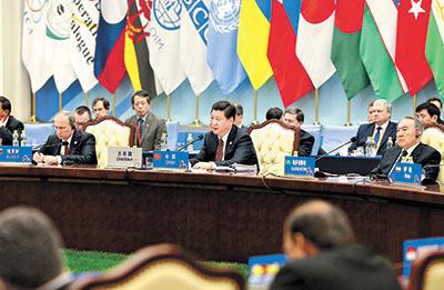 上午9時15分許,與會各國和國際組織的領導人和代表陸續抵達世博中心。他們主要是:哈薩克斯坦總統納扎爾巴耶夫、俄羅斯總統普京、阿富汗總統卡爾扎伊、阿塞拜疆總統阿利耶夫、伊朗總統魯哈尼、吉爾吉斯斯坦總統阿坦巴耶夫、蒙古國總統額勒貝格道爾吉、巴基斯坦總統侯賽因、塔吉克斯坦總統拉赫蒙、烏茲別克斯坦總統卡里莫夫、斯里蘭卡總統拉賈帕克薩、柬埔寨首相洪森、聯合國秘書長潘基文等。習近平迎候在那里,同他們一一握手。