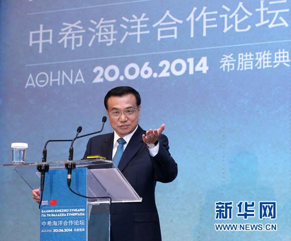 6月20日,國(guó)務(wù)院總理李克強(qiáng)在雅典與希臘總理薩馬拉斯共同出席中希海洋合作論壇并發(fā)表演講。新華社記者 龐興雷 攝