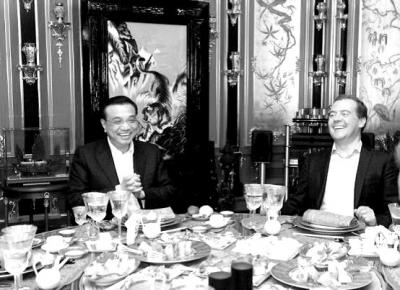 13日當天,李克強與梅德韋杰夫舉行了四次會面——小范圍會談、大范圍會談、歡迎午宴、私人晚宴,相處時間超過10個小時。
