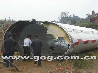 昨日,記者在主體殘骸墜落地現(xiàn)場(chǎng)看到:一個(gè)像中巴車般大小的圓柱體橫躺在已收割的包谷地里,由于殘骸墜落時(shí)巨大的沖擊力,圓柱體已略變橢圓,但仍較為完整,一個(gè)鐵架子的幾支腳已鉆進(jìn)了泥土里,還有一個(gè)像大塑料長(zhǎng)管子的物件墜落在一姓吳的農(nóng)家房屋中堂,并將該堂屋擊壞。