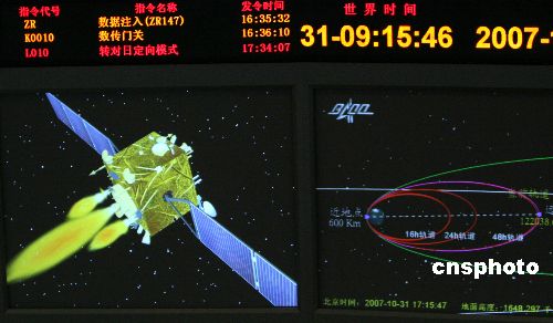 北京時間十月三十一日十七時十五分,北京航天飛行控制中心成功對“嫦娥一號”衛星實施第三次近地點變軌,也是衛星入軌后的第四次變軌,衛星順利進入地月轉移軌道,由此真正開始了她的奔月之旅。 中新社發 孫自法 攝