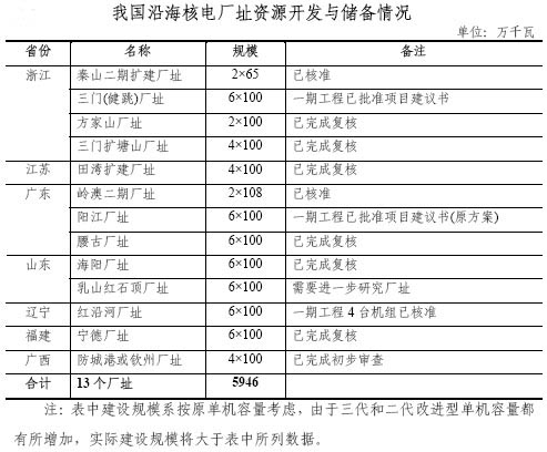 該《規(guī)劃》指出,經(jīng)過多年努力,中國已儲備了一定規(guī)模的核電廠址資源。除已建和在建工程外,在沿海地區(qū)開展前期工作已較充分的廠址還有5000多萬千瓦(見上表)。此外,2004年以來,在廣東粵東(田尾廠址)地區(qū),浙江浙西地區(qū)、湖北、江西、湖南等地都開展了核電廠址普選工作,進一步增加了核電廠址儲備。