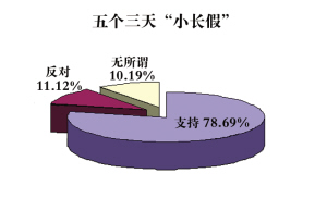 據(jù)統(tǒng)計(jì),昨天上午方案公布至22時(shí),五大網(wǎng)站共有約45萬(wàn)名網(wǎng)民參與了調(diào)查。投票結(jié)果顯示,近九成網(wǎng)民支持國(guó)家法定節(jié)假日總天數(shù)由10天增加到11天,七成多的網(wǎng)民支持增加清明、端午、中秋三個(gè)傳統(tǒng)節(jié)日為國(guó)家法定節(jié)假日,八成網(wǎng)民支持保留十一國(guó)慶節(jié)和春節(jié)兩個(gè)黃金周,八成多的網(wǎng)民支持將春節(jié)放假時(shí)間提前到除夕,近八成網(wǎng)民支持將元旦、五一及三個(gè)新增法定假日與前后周末調(diào)整成連續(xù)三天的“小長(zhǎng)假”,九成多的網(wǎng)民支持全面推行職工帶薪休假制度。