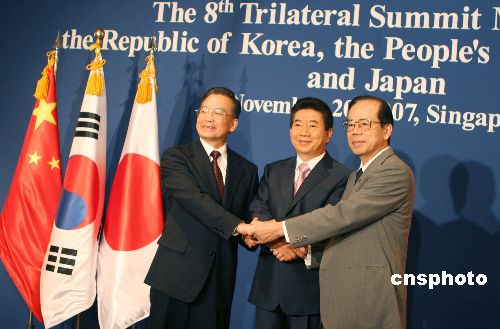 中新網新加坡11月20日電(記者 周群)第八次中日韓領導人會議今日在此間舉行。中國總理溫家寶、日本首相福田康夫、韓國總統盧武鉉出席會議。