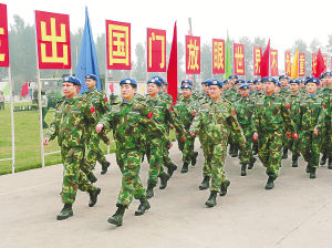 “走出國門,傳承文明友誼;維護和平,共建和諧世界!”一隊頭戴藍(lán)色貝雷帽、身穿迷彩服、胳膊上佩戴著“地球和橄欖枝”臂章的士兵踏著整齊的步點,喊著鏗鏘有力的號子,出現(xiàn)在筆者面前。