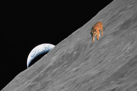 一個(gè)頭腦機(jī)靈的網(wǎng)民把華南虎“調(diào)”到月球上。利用電腦合成軟件,他把老虎照和月亮成像照合成在一起,上寫說明云:“嫦娥一號(hào)發(fā)回首張照片,月球上發(fā)現(xiàn)華南虎一只,專家正在對(duì)照片真假做鑒定,預(yù)計(jì)結(jié)果將會(huì)在中國(guó)人登月后公布(大約2020年)。”