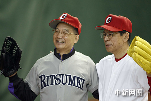 溫家寶身著35號球衣應約和福田康夫切磋棒球球藝