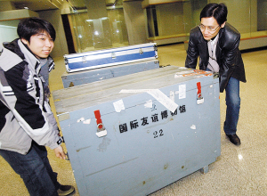 昨天下午1時(shí)許,在工作人員嚴(yán)密押送下,4個(gè)裝載著國禮珍品的密封箱運(yùn)抵周鄧紀(jì)念館院內(nèi)。還未見珍品,那些專門為展品“量身定做”的箱子就讓人很感興趣,每個(gè)箱子都有1米多高,由于展品極其珍貴且是易碎品,在包裝時(shí)里面不僅加了防震的材料,箱子外面也特別注明易碎標(biāo)志,每一件珍品都被固定在專門的錦盒中,且是根據(jù)它們的大小和形狀量身定做的。