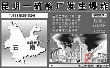 昨日凌晨3時50分許,昆明市西山區海口鎮云天化國際化工股份有限公司三環分公司硫酸廠硫磺倉庫,在硫磺裝卸過程中,硫磺粉塵發生爆炸并起火燃燒。事故共造成5人死亡,32人受傷,兩人失蹤。