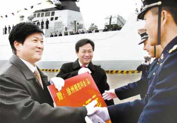 1月27日,海軍東海艦隊某軍港彩旗招展,軍樂激揚,一艘新型戰(zhàn)艦懸掛滿旗,威武莊嚴,海軍“徐州艦”入列命名授旗儀式在這里隆重舉行。南京軍區(qū)副政委兼海軍東海艦隊政委徐建中中將,海軍東海艦隊參謀長王志國少將、政治部主任高長清少將,駐舟山部隊首長包裕平、劉蘇閩少將,舟山市領(lǐng)導(dǎo)鐘達、周偉江,我市領(lǐng)導(dǎo)曹新平、王昊等出席入列命名授旗儀式。