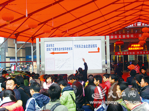 “下列車次在此進(jìn)站候車,其余車次請(qǐng)到廣場黃色臨時(shí)候車棚候車。”在站前廣場,記者看到原先旅客等候進(jìn)站的區(qū)域已搭起多個(gè)不同顏色風(fēng)雨棚,在候車大廳門口的紅色風(fēng)雨棚前,立著一塊提示牌,牌子上分左右列出了各趟列車的候車要求,因此旅客們可以及時(shí)得知自己所乘列車的運(yùn)行情況,憑票提前2小時(shí)由此進(jìn)站候車,而在一邊的黃色風(fēng)雨棚內(nèi),則是等候稍晚到達(dá)列車的旅客。由于分類清晰,整個(gè)火車站的候車秩序良好。