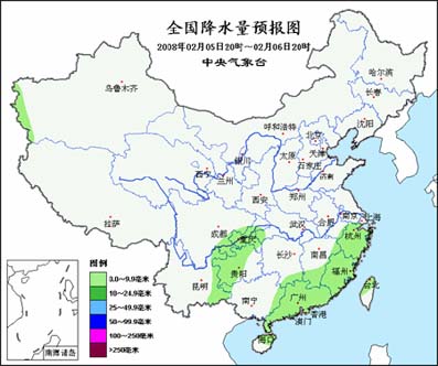 5日20時至6日20時,新疆西南部、浙江北部、江西東北部、云南東北部等地陰有小到中雪或雨夾雪;湖南南部、江西南部、浙江中南部、福建大部、廣東、廣西東部、海南以及四川盆地南部、重慶大部、貴州中西部、云南東南部、臺灣等地陰有小雨,其中,貴州中西部的部分地區有凍雨。內蒙古中東部、華北北部、東北地區、黃淮東部等地有4級左右偏北風;東部和南部海區有5~7級偏北風。