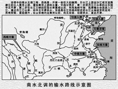 南水北調工程輸水示意圖。西線:開鑿一些巨大的隧洞,引長江上游金沙江或支流雅礱江的水入黃河上游,增加黃河上游的水量。中線分兩步:第一步把丹江口水庫的水引到華北平原;第二步在長江三峽的巨型水庫建成以后,利用高峽平湖,筑渠輸水自流進入漢江,通過丹江口水庫,向華北平原供水。東線:在江蘇揚州附近把長江水抽進京杭運河,用閘控制,逐級提升;在山東境內過黃河以后,向北自流,沿路供水,直達天津。
