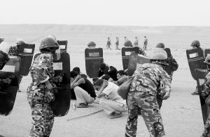 前方指揮部王部長立即下達捕殲命令。頓時,一排排突擊炮彈朝著“恐怖分子”駕車沖來的公路傾瀉。直升機飛臨上空。第五作戰小組10多名戰斗隊員從直升機上躍下,直撲“恐怖分子”。